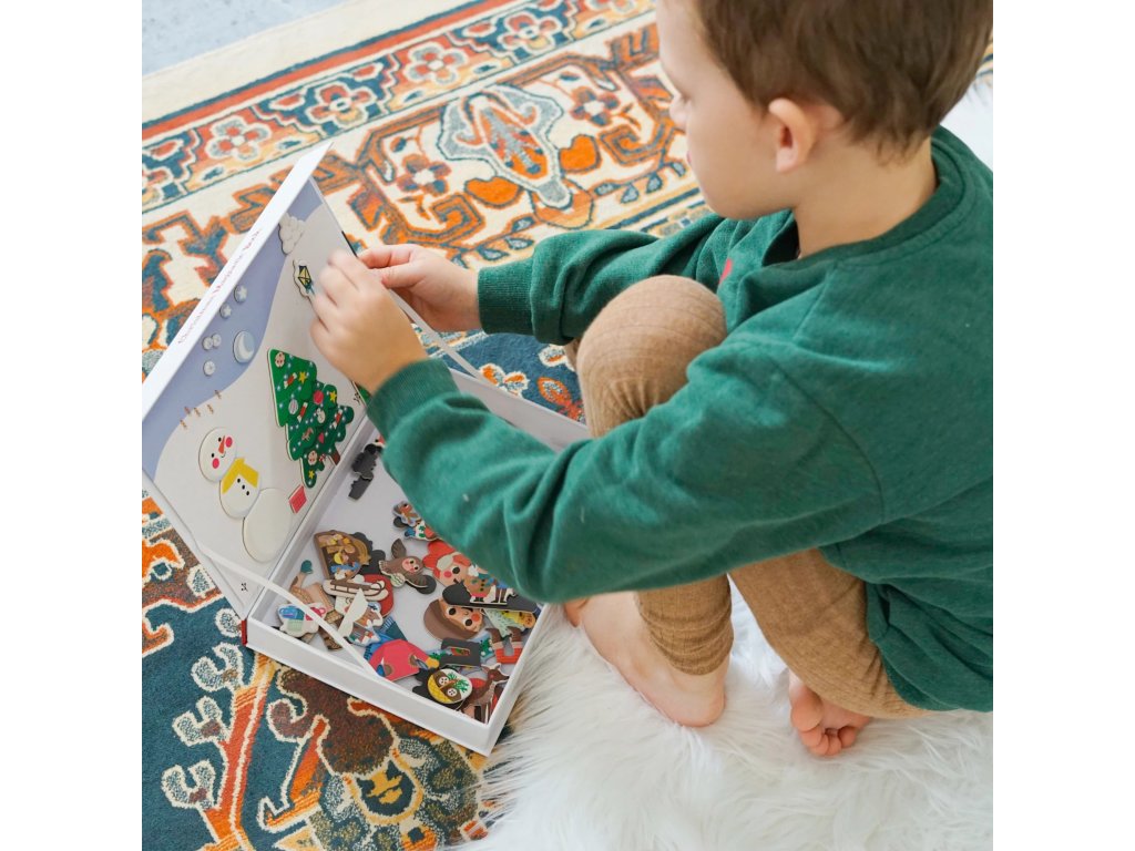 Deti si môžu vybrať z 4 predlohových kartičiek a poskladať si obľúbené zimné alebo vianočné scény – ozdobovanie stromčeka, stavanie snehuliaka, guľovačku či čakanie na Mikuláša. Fantázii sa však medze nekladú, preto môžu tvoriť aj vlastné príbehy a dekorácie.
