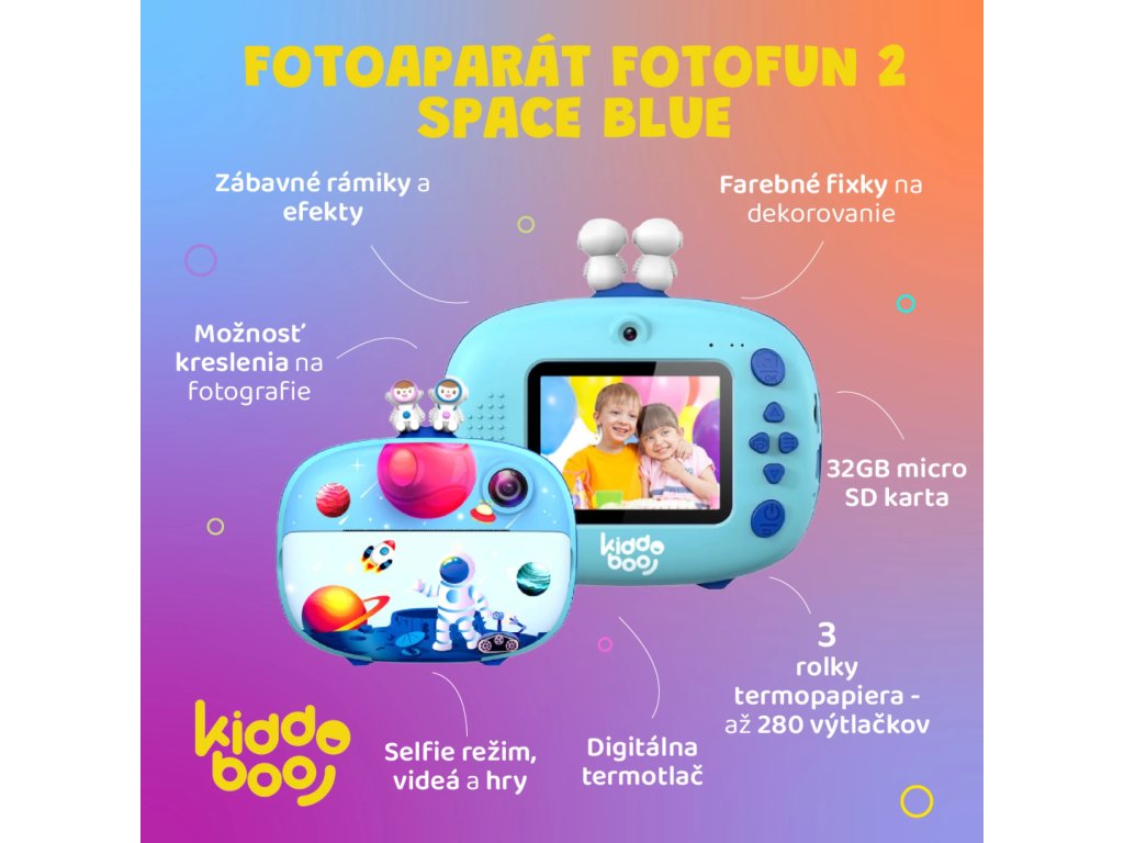 Objavujte vesmír plný fantázie s Kiddoboo FotoFun 2 Space Blue – detským fotoaparátom, ktorý umožňuje fotenie, natáčanie videí a okamžitú tlač bez atramentu. Tento štýlový foťák v modrom vesmírnom dizajne podporuje detskú tvorivosť a zvedavosť – doma, na výlete aj na oslave.