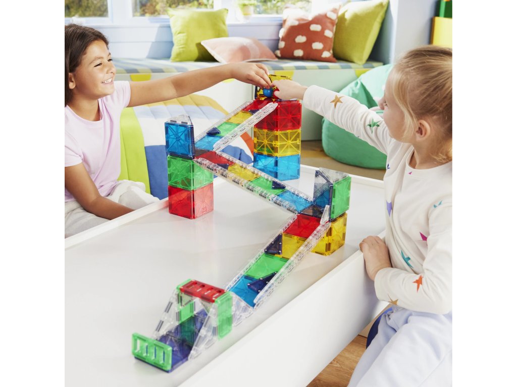 Vytvor si vlastnú pretekársku dráhu snov s MAGNA-TILES® Rail Racers Deluxe – 90-dielnou sadou, ktorá prináša dynamickú zábavu pre malých i veľkých staviteľov. Táto sada obsahuje inovatívne priehľadné koľajnice s patentovaným dizajnom, rampy, mosty a magnetické dieliky microMAGS™, ktoré sa jednoducho spájajú bez potreby spojok. Guličky rozbehnú trať a zažijete vzrušenie z fyziky, tvorivosti a nekonečnej fantázie.